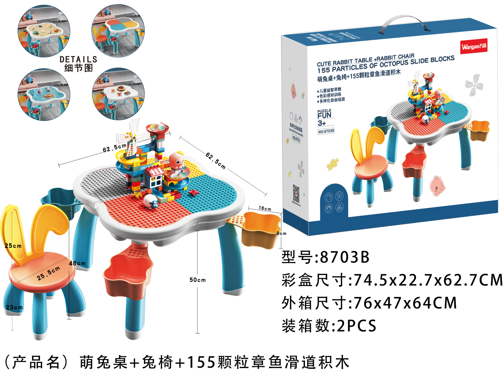 萌兔桌墨藍(lán)+兔椅+四收納盒+155顆粒章魚滑道滾球積木